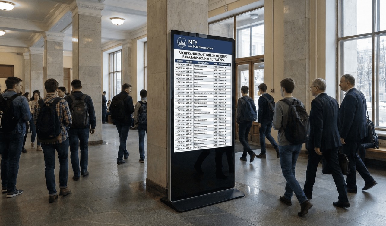 Актуальное расписание уроков, лекций и мероприятий на экранах в холлах, коридорах и аудиториях.